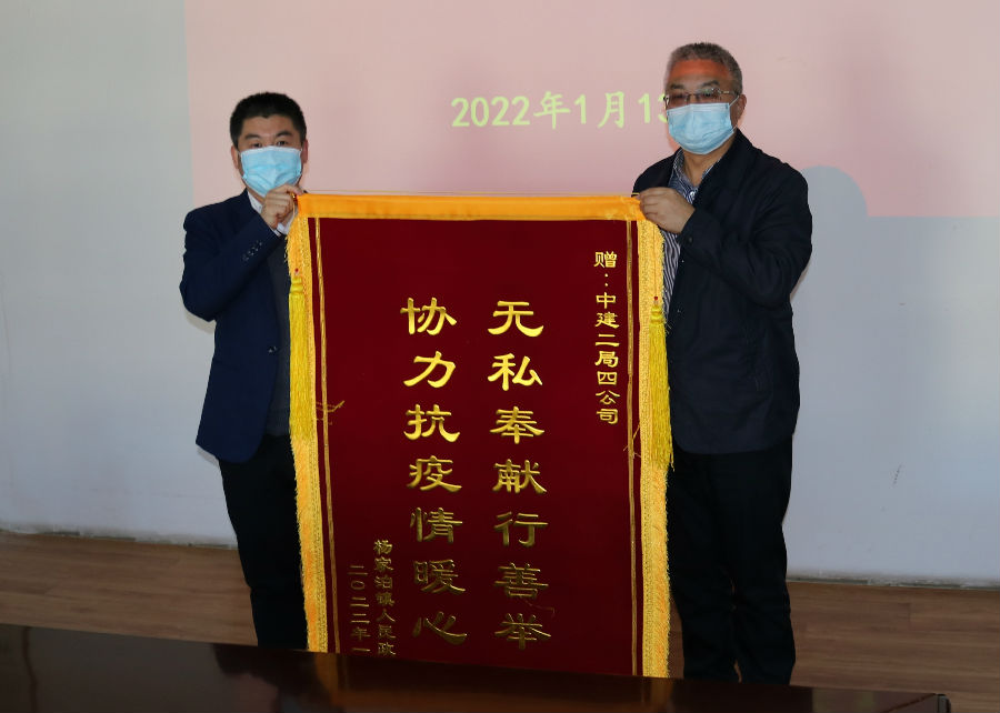 捐贈現場,楊家泊鎮黨委書記王會勝對團區委、中建二局四公司積極支持楊家泊鎮疫情防控表示衷心感謝,并為中建二局四公司送上了“無私奉獻行善舉、協力抗疫情暖心”的錦旗。王會勝表示,此次捐贈正是雪中送炭,讓奮戰在一線的抗疫工作人員感受到了企業的關懷和溫暖,今后楊家泊鎮將繼續高標準高質量做好疫情防控工作,確保守護好人民群眾的生命安全。